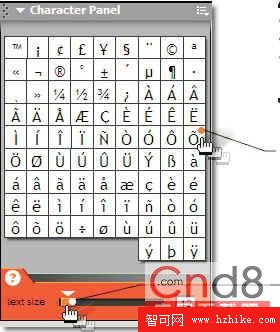 功能當然就是插入特殊字符了,它是直接在fwmx中增加了一個面板,該面板如下圖,選擇window > character panel即可顯示該面板,該面板具有同fwmx中其他面板一樣的功能,可以與其他面板組合。