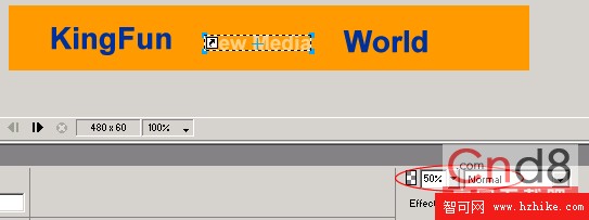 (1)新建一文件,canvas設為480x60,標准的banner條尺寸。我們分別鍵入三個文字。選擇中間要做變化的New media這個元素,按f8轉換為graphic symbol。按shift+ctrl+d進行clone,然後把clone出來的symbol進行適當縮小,並在屬性面板中將其透明度設為50%,如圖: