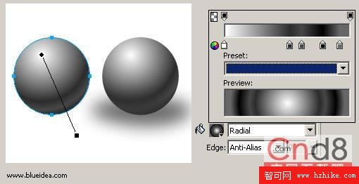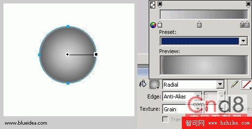 選擇圓形工具,按住shift 鍵,在畫面中,畫一個正圓形,然後選擇填充工具,在屬性面板上,把填充方式改為 radial,並且編輯填充樣式如圖,這個填充樣式包括四個控制顏色點,詳細的制作你的填充樣式,是你仿真成功的要點。我這個樣式的主要功能是打出底色,並且把小球的反光也鋪出來。