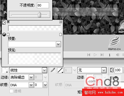 再利用矩形工具繪制一個寬350px,高23px的矩形.設置為漸變>>線性填充,如圖,兩端都為白色,左邊透明度為80%,右邊透明度為40%,,無邊框,矩形圓度為15,不透明度為100%.