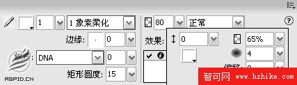 再利用矩形工具繪制一個寬350px,高50px的矩形.設置為無填充,1像素柔化的白色邊框,矩形圓度為15,不透明度為80%,效果為陰影和光暈>>發光.參數如圖