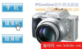 用相同的方法繼續為“攝像機”和“隨身聽”按鈕在“交換圖像”對話框中建立各自的圖像切片鏈接。完成後我們就可以按F12鍵在浏覽器中查看了。怎麼樣,效果還不錯吧!如圖06。