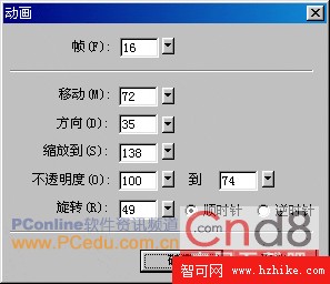 在這裡,可以設置動畫的幀數、圖像的移動距離、運動方向、縮放程度、不透明度的變化以及旋轉的方向和角度等。設置完成後可點擊“確定”按鈕。如果此時的“幀”浮動面板裡的幀數少於當前將要創建的動畫幀數時,則會彈出一個提示框,示意是否為當前動畫建立足夠的幀數。再次點擊“確定”後,軟件將自動把該圖形對象轉成動畫元件並按剛才所設置的動畫參數,自動成動畫效果。我們可通過Fireworks畫布文檔下方的動畫播放按鈕進行效果查看。如圖02。