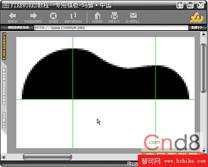 4.選擇“刀子”工具,延中間的橫向輔助線將雙圓形切開,刪除下半部分(因為沒有對下半部錨點做調解,所以就刪掉了)