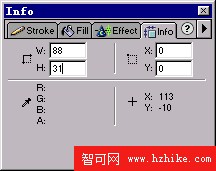 第三步、選定矩形對象,打開Info(信息)面板,將W、H、X、Y內各個數值框的設定值進行相應修改,來改變剛剛繪制矩形的大小和位置,使得矩形的大小正好適合編輯區的大小,具體的設定如圖02所示: