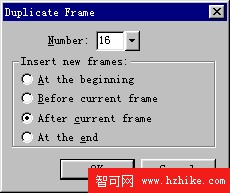 4、選擇Frames(影格)面板,點擊右上角小箭頭,在彈出菜單中選擇Duplicate Frame(復制影格)選項。在談出對話框中選擇復制的影格數目。