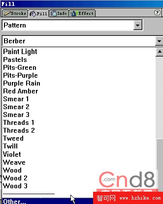 7、選中我們剛才畫的矩形,打開Fill面板,填充方式我們選中Pattern(圖案填充),然後在圖案選項中我們選中最下面的other