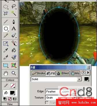 二、用橢圓工具,在位圖上畫一個橢圓,填充色為黑色。並在其fill面板中,設置edge為feather,默認為10,不過我們可以設得比較大。