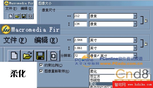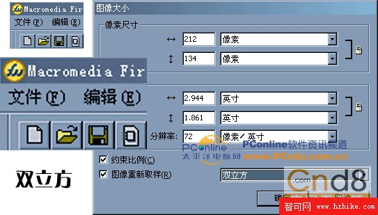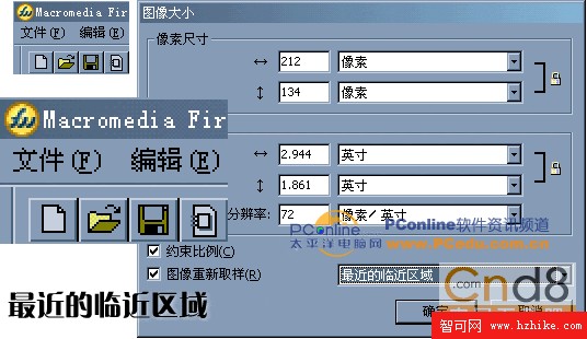 2、選中編輯區的圖像對象,打開“圖像大小”的設置窗口,將圖像大小由106 X 67像素改成212 X 134 像素,單擊確定按鈕圖像即以默認的雙立方插值方式大大增加了圖像大小。我們已經知道二次立方的插值方式是在原有的兩個像素之間插過渡值,因此我們看到:盡管畫面已經虛了,可畫面中的圖像部分還是合乎情理的,但文字部分虛的比較厲害。請參看下圖。