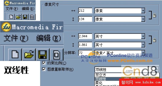 4、將圖像大小由106 X 67像素改成212 X 134 像素,設定插值方式為“雙線性”,單擊確定按鈕,我們可以看到:圖像比起“雙立方”方式設定後產生的效果要更為柔和,而文字也較“最近的臨近區域”要柔和些,能體現出文字的柔和度來。也就是說這種方式是介於“雙線性”和“最近的臨近區域”兩種方式中間的一種方式。請參看下圖。