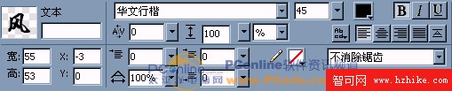 2、在編輯區輸入文字對象,這裡輸入了“風”這個字,字體為“華文行楷”,字號大小隨意,此處采用了“45”,並且“加粗”文本對象,將邊緣效果設為“不消除鋸齒”,具體設置如下圖所示。