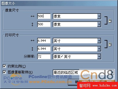 4、在編輯區以外的任意地方單擊鼠標左鍵,屬性面板成為“文檔”屬性面板的顯示狀態。單擊面板上“圖像大小”按鈕,在彈出的“圖像大小”設置框中,將圖像的“像素尺寸”區域的寬和高的數值大小都設為 500,然後單擊“插值法”的下拉菜單,將插值方式設為“最近的臨近區域”,具體設置如下圖所示。