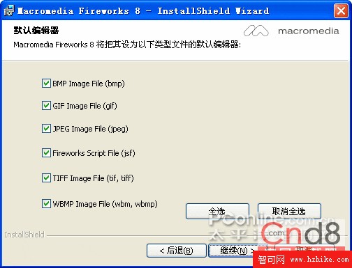 首先友情提醒大家,在安裝Fireworks的過程中,如果出現下面的“默認編輯器”安裝界面的時候,也就是設定文件關聯界面提示的時候最好不要選擇全部關聯,可以根據實際情況進行選擇,否則,安裝完畢後,這些相關類型的圖片的默認打開工具就變成了 Fireworks 8 了,相信你不會希望看個很普通的圖片都要使用 Fireworks 8 來進行吧?