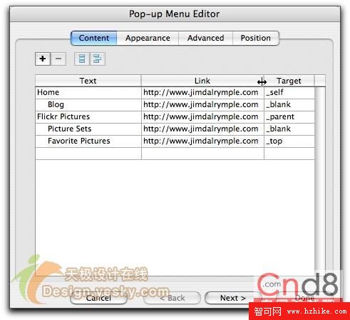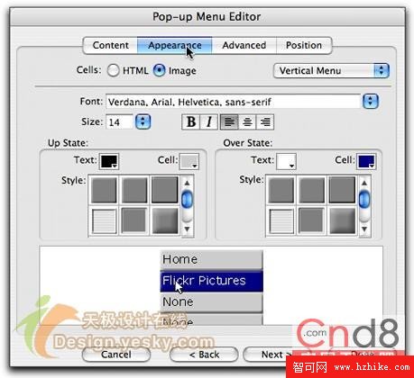 要在Fireworks中創建CSS彈出菜單,用戶可以選擇圖像中的一個熱區或切片,然後打開彈出菜單編輯器,彈出菜單編輯器會以向導的形式出現,用戶只需要按提示一步步操作,就可以很容易地創建出專業的CSS彈出菜單。