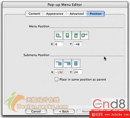 最後一個選項卡是用於設置菜單及子菜單位置的。Fireworks允許用戶指定菜單及子菜單的X坐標和Y坐標。