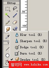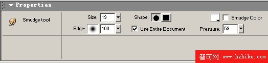 三.全選,同時按下ctrl+shift+alt+z組合鍵,將這組圖形轉化為位圖,選擇菜單Filters-blur-blur more對圖形進行模糊處理,接下來便是讓它“燃燒”起來!使用塗抹工具,對圖形進行加工。這是最關鍵的步驟,點擊塗抹工具後,最下面出現屬性欄(PropertIEs),其中的各個參數值的效果大家必須熟悉。如下圖,其中Size:塗抹范圍大小,Pressure:壓力強度,Edge:尖銳程度(可以理解為羽化范圍),Smudge Color:塗抹的初始“痕跡”顏色,去掉方框內的對號,表示不用初始顏色,在這裡我們將它去掉。
