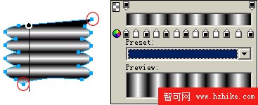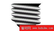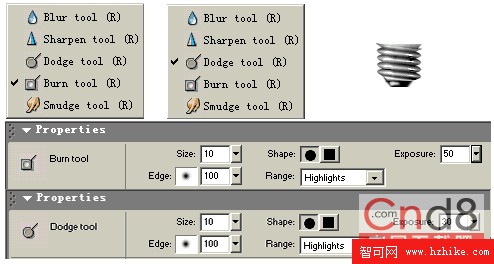 4.再分別用Fireworks MX提供的新功能 “Burn tool”和“Dodge tool”在適當的地方進行碳化和添加高光。在使用這兩個工具時一定要調整好參數,下手要利落、干淨,輕重也要掌握好,其實這步操作也是較麻煩的。經過這步操作後就有了金屬螺旋的感覺,進行適當縮放。具體設置和效果如圖: