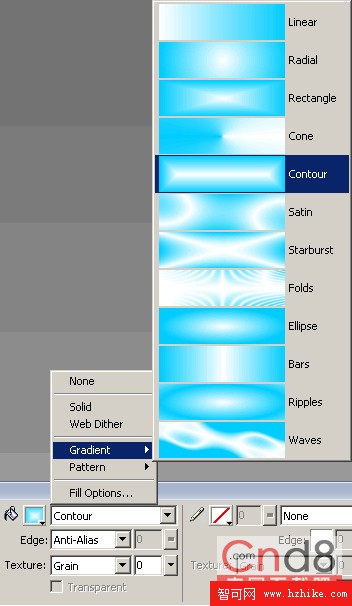 看看填色設置表,有沒有發現多了一樣東西?是的,這就是FW MX 2004版本新增的等高漸變填充??Contour。