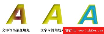 接下來我們來試驗一下文字。你會發現文字直接應用等高漸變填充後仍然是生硬的方形填色。只有你把文字轉為路徑Convert to Path(快捷鍵Ctrl+Shift+P),填充顏色才可以沿輪廓線漸變。這裡我們放了個內斜角的效果做比較,可以看到等高漸變填充的表現更出色。
