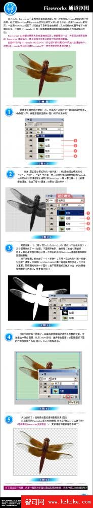 很久以來,Fireworks一直因為沒有通道功能,為不少慣用Photoshop摳圖的用戶所诟病,經過對Photoshop和Fireworks的對比研究,本人終於不必一邊用Fireworks做網頁,一邊用Photoshop摳圖了,既省去了導來導去的麻煩,又為可憐的機器節省下PS所需的內存。下面用 Fireworks 8 和一張翅膀需要細致摳圖的蜻蜓圖片為例講解此方法。