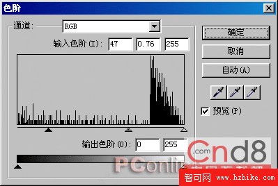 在“輸出色階”右邊的兩個參數編輯框中控制輸出圖像的對比度,第一個為暗調像素的亮度值,第二個為高光像素的亮度值。