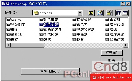 Fireworks中的“特效”也被稱為特效插件,也就是第三方濾鏡。這和Photoshop中的濾鏡概念是一樣的。例如“添加效果”按鈕中的Eye Candy 4000 LE項就是AlIEn Skin公司提供的濾鏡。不僅如此,Fireworks還可以加入Photoshop6.0之前版本的部分濾鏡,具體的操作方法如下: