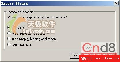 單擊“Continue”按鈕,就會出現圖9所示的對話框,在這裡可選擇導出圖像的用途:The web(網站)、An image-editing application(圖像編輯應用程序)、A desktop publishing application(桌面出版應用程序)和Dreamweaver,當選擇第一個和第四個單選按鈕將輸出GIF和JPEG格式,而選擇另外兩個單選按鈕通常輸出TIFF格式的文件。這裡選擇“The web”單選按鈕,單擊“Continue”按鈕後,Fireworks會對這幅圖像進行分析,然後提出一個適合於用戶用途的優化建議方案來,如圖10所示。
