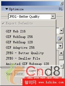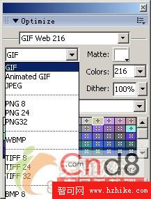 2. 在“Optimize”面板中選擇文件格式,如圖1所示,此時應根據文件類型選擇不同的文件格式。例如,如果圖中重復顏色區域較多的話,則適於使用GIF格式,對於這種格式,可相應地使用“Dither”(抖動)來補償因顏色減少而造成的圖像質量下降。對於JPEG格式,可使用“Smooth”(平滑)來使圖像稍微模糊,從而減小圖像大小,一般照片使用 JPEG格式可能更好一些。