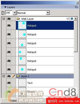 另外,我們還可以利用層面板來顯示和隱藏熱區。點擊層面板的熱點前的眼睛圖標(如圖11所示)就可以隱藏該熱區。隱藏了熱區之後,再次點擊該區域,眼睛圖標又顯示出來了,這樣所選熱區也重新顯示出來了。