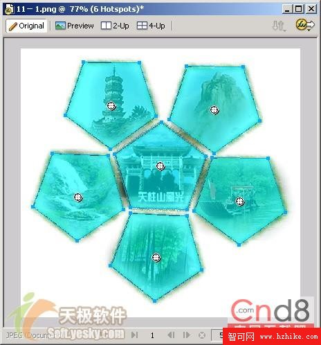 另外,我們還可以根據路徑或者所選對象輪廓來生成熱區。首先選中作為熱區的路徑或對象,然後選擇“Edit”菜單下的“Insert”->“Hotspot”就可以為其添加熱區了。如果選擇一個路徑對象,那麼這個對象區域就被定義為熱區。如果選擇多個對象,如圖6所示,我們選擇天柱山風光圖的六幅小圖的邊界路徑,接著選擇“Edit”菜單下的“Insert”->“Hotspot”,這時候會跳出圖7所示的對話框,我們選擇“多重”按鈕,這樣就為所有的小圖像添加上了熱區了,如圖8所示。