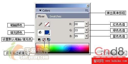 可以點擊Fireworks界面中“Window”菜單下的“Mixer”(色彩混合器)或者“Swatches”(色彩樣本),我們可以打開Fireworks的Colors(色彩)面板。我們發現色彩混色器和色彩樣本是默認組合在Fireworks的色彩面板之上的。混色器面板上的各項功能如圖13所示。