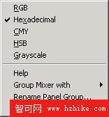 點擊右上角的按鈕這時會跳出圖14所示的彈出菜單,菜單上部有Fireworks MX 2004色彩模式選項。彈出菜單的下部則是關於面板的一些操作,包括重新組合面板、重命名面板等。