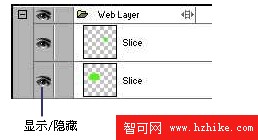 打開圖層面板點擊slice(切片)層上眼睛的圖標,就可以顯示和隱藏圖標