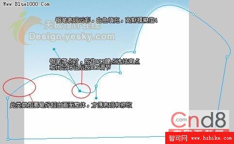 依然是鋼筆勾畫,填充為白色,並進行高斯模糊,高斯模糊值為4,這裡需要大家注意下ALT鍵在鋼筆勾畫路徑中的作用,雲的作法簡單的說有2種,一種是先大體勾勒出來輪廓,按住ALT調節節點,這樣的好處是調節此節點時,下一個節點的位置不會受影響,可以慢慢調節到你滿意為止;另一種是第一筆仔細畫,在開始第二筆時按住ALT鍵點選第一筆的結束節點,這樣畫第二部分時不會受到影響。