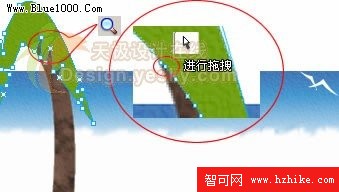 復制一個我們剛才畫的路徑,保持白色填充,邊緣輪廓顏色取我們畫的海水淺顏色部分,,筆尖大小為2,筆觸為基本--柔化圓形,仍然保持高斯模糊.選取此路徑,點選菜單修改---平面化所選,將此路徑轉化為位圖,我們再選擇橡皮工具或者減淡工具,對海水邊緣部分進行擦除或者減淡,得到以下一個效果圖: