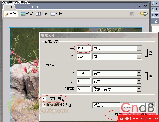 3、 調整圖片大小,選擇“修改”—“畫布”—“圖像大小”,“像素尺寸”寬設置成“420”像素,設成“約束比例”,按“確定”。(見下圖2.jpg)