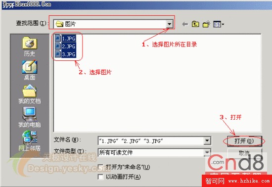 1、 運行Firework8,選擇“文件”——“打開”,在“查找范圍”選擇圖片所在的目錄,將選擇圖片,按“打開”。(見下圖1.jpg)