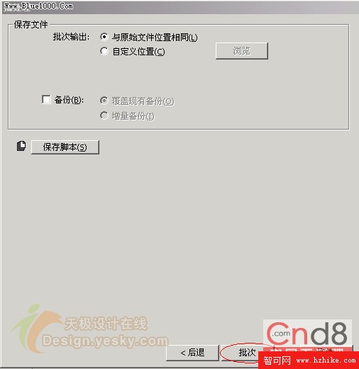 4、 出現另一個“批處理”對話框,“批次輸出”如選“與原始文件位置相同”則覆蓋原有的文件,可選擇備份方式,也可以不選擇備份,點擊“批次”。(見下圖8.jpg)