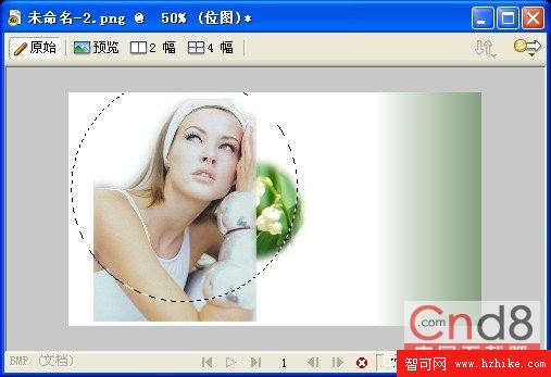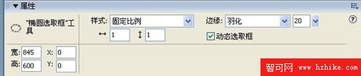 7.在Fireworks 8的新窗口中打開事先准備好的圖像素材“花草.jpg”,選擇繪圖工具欄中的【橢圓選取框】工具,在【屬性】面板中進行相應的設置,如圖1.7所示。