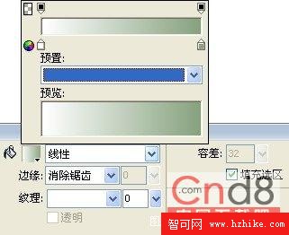 5.選擇繪圖工具欄中的【漸變】工具 ,這時【屬性】面板會自動變成漸變色的調節屬性。設置漸變的類型為線性漸變,漸變顏色為白色過度到綠色。如圖1.5所示。