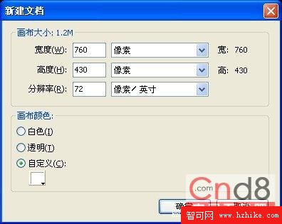 2.在彈出的【新建文檔】對話框中設置畫布的寬度為760像素,高度為430像素,背景顏色為白色。如圖1.2所示。