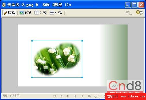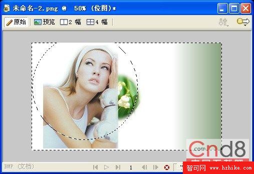 20.在Fireworks 8的新窗口中打開事先准備好的圖像素材“向日葵.jpg”,選擇繪圖工具欄中的【多邊形套索】工具,其屬性設置和前面一致,把向日葵選擇下來,並且復制到當前畫布中。如圖1.19所示。