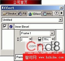 4、 接下來我們將在文檔頂端創建按鈕對象,首先在層面板中新建一個“導航層”,利用矩形工具創建“公司首頁”按鈕對象,大小為140x15,填充為紅色與黑色之間的線性漸變填充,打開Effect面板,設定Inner Bevel特效,如下圖所示: