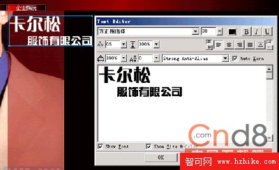 1、 選擇工具面板的文字工具,打開文字編輯窗口,輸入“卡爾松服飾有限公司”,如圖所示:
