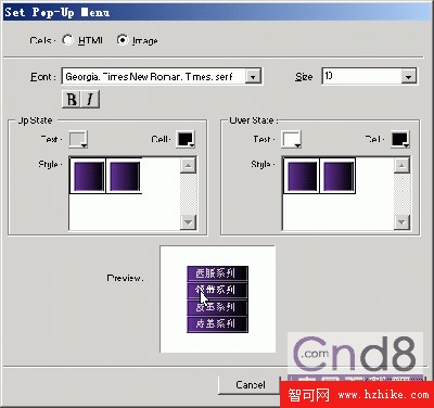 5、 點擊Next進入下一個設置窗口,在這裡我們可以設置文字的大小,菜單的樣式等屬性,您既可以選擇最終的菜單外觀是標准的Html格式,或者是Image圖片格式。我們選擇圖片格式,並設定文字大小為10。