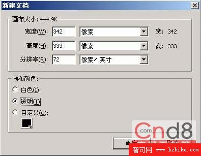 1.打開Fireworks MX,按下Ctrl + N新建一個寬為342像素,高為333像素、分辨率為72像素/英寸、畫布顏色為“透明”的文件。