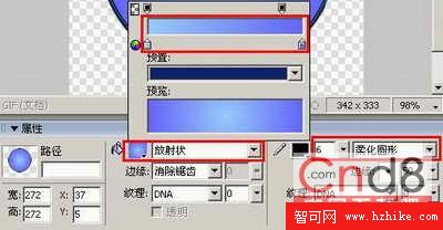 2.然後在工具欄裡選擇“橢圓選取框”工具,然後在“屬性面板”中將填充類別設置為“放射狀”,然後單擊填充顏色框,將左邊的色標顏色選擇為“#99CCFF”,右邊的色標顏色選擇為“#6666FF”,描邊顏色設置為黑色,描邊種類設置為“柔化圓形”,然後再拖動描邊大小滑桿,設置大小為6象素,按下Shift鍵,畫出一個圓形,“屬性面板”具體設置下圖所示。