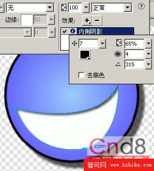 9.新建一層,然後選擇“橢圓選區框”工具,“屬性面板”中設置填充類別為“實心”,顏色為黑色,描邊種類為無,然後畫出娃娃左邊的眼睛,然後設置效果為“凹入浮雕”,具設置數值如下圖所示。