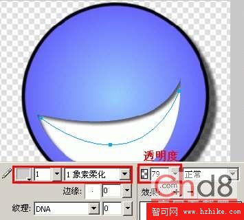 6.再新建一層,起名為“分唇線”。使用鉛筆或鋼筆工具給我們的娃娃先添加一條弧形的線條,將上下嘴唇分開,其線條描邊種類為“1象素柔化”、透明度79,顏色為#CCCCCC。