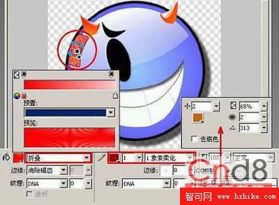 13.新建一層,選擇“橢圓”工具,填充類別選擇“放射狀”、邊緣為“消除鋸齒”、描邊種類為“1象素柔化”、筆尖大小為3。填充顏色框中左邊色標顏色代碼為#CCFF00,右邊顏色代碼為#669900,畫出小魔鬼的右手,這只右手是用來握這只小鐵钗的。接下來設置這個圓手的效果為“投影”,為小魔鬼的這只右手增加投影效果。其參數為:距離為24、透明度為55%、柔化為6、角度為315。